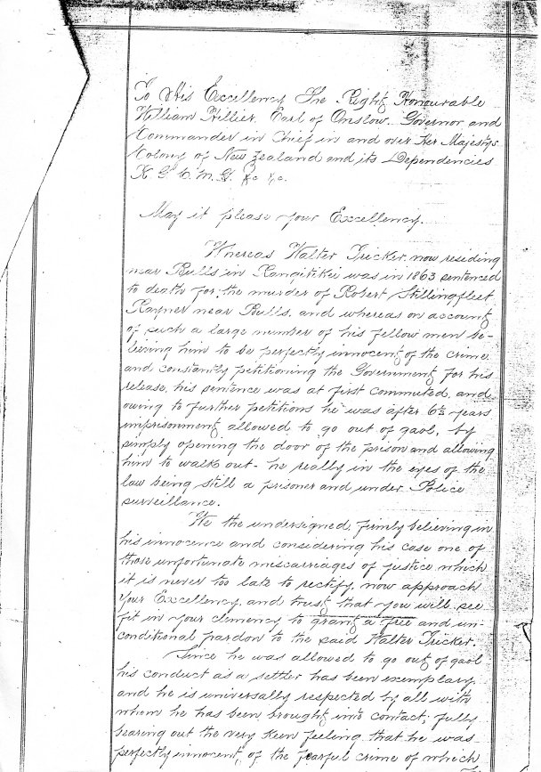 Whereas Walter Tricker, now residing near Bulls in Rangitikei, was in 1863 sentenced to death for the murder of Robert Stillingfleet Rayner near Bulls, and whereas on account of such a large number of his fellow men believing him to be perfectly innocent of the crime and constantly petitioning the Government for his release, his sentence was at first commuted, and owing to further petitions, he was after 6½ years imprisonment allowed to go out of gaol, by simply opening the door of the prison and allowing him to walk out. He really, in the eyes of the law being still a prisoner and under Police surveillance.