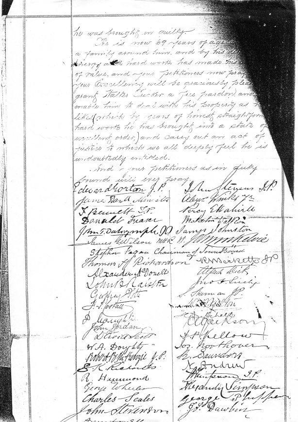 We the undersigned firmly believing in his innocence and considering his case one of those unfortunate miscarriages of justice which it is never too late to rectify, now approach Your Excellency and trust that you will see fit in your clemency to grant a free and unconditional pardon to the said Walter Tricker.