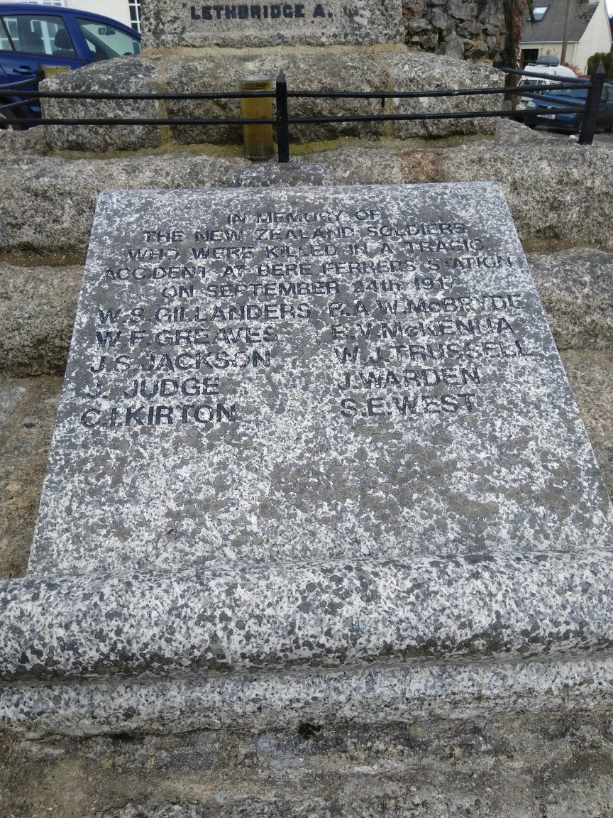 There is also a memorial to the New Zealand boys beside the Bere Ferrers town war memorial and a bronze plaque beside the New Zealand flag in the church.