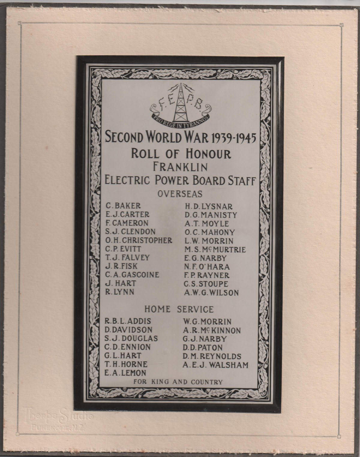 Thanks to Christine Madsen - her copy of the Roll of Honour has 'With the Compliments of the Franklin Electric Power Board 5th October 1947.