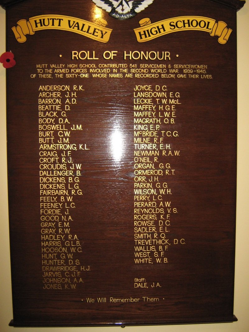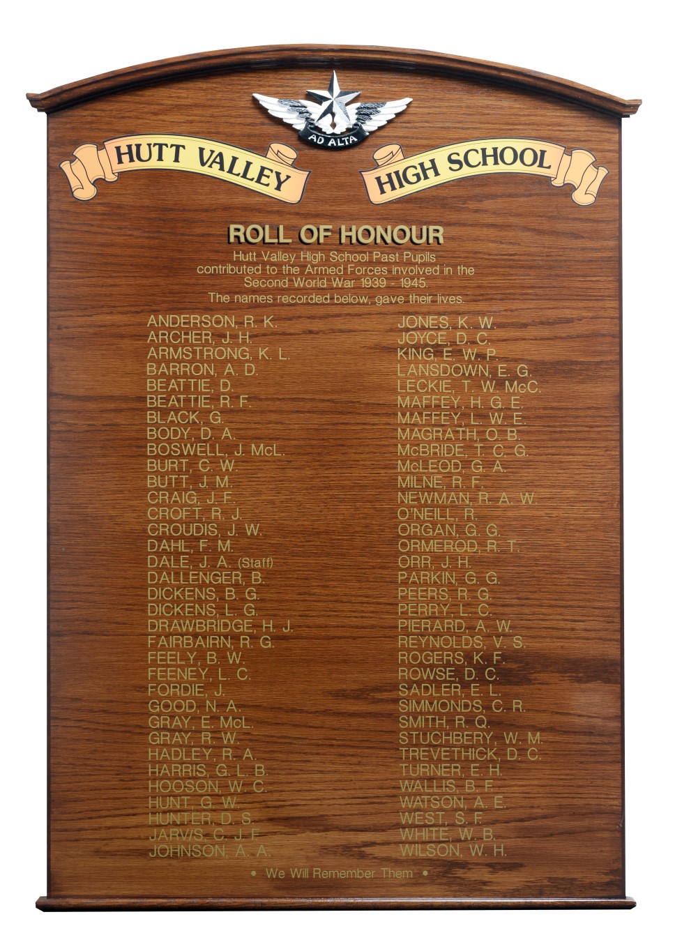 A few years ago the Hutt Valley High School Archive Department (thanks to Judith Gardiner) sent me a photo of their World War Two Roll of Honour. Since then, research on the names has been completed and seven more past pupils have been added to a new board which was dedicated on Monday 29 April 2019 at the schools annual ANZAC ceremony.