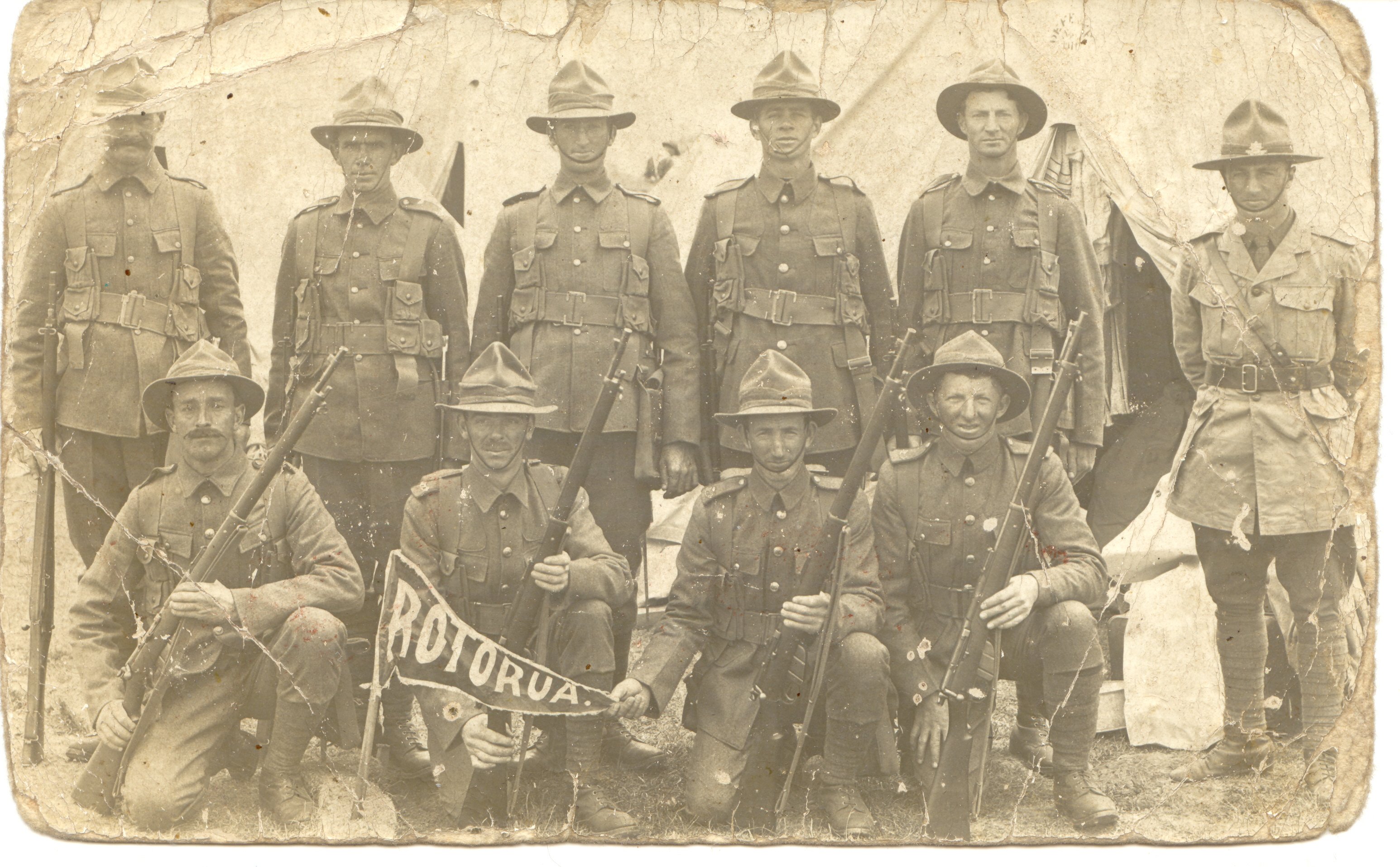 The following photograph of Rotorua Squad 2 was probably taken in November 1914. George Douglas Tayler is kneeling behind the flag and his best friend John Albert Harp is 5th from left at the back. Harp is on the honor roll as he was killed on 5 June 1915 at Gallipoli. If you recognise any of the others in the photo, George D Tayler's grandson Steve Tayler would love to hear from you at - steve.gallip - at -gmail.com.